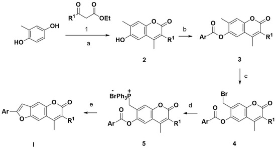 In the presence of concentrated sulfuric acid, 2-methylbenzene-1,4-diol reacted with 1,3-dicarbonyl compounds 1 (ethyl acetoacetate, ethyl 2-chloroacetoacetate) to produce coumarin 2, then, at anhydrous K