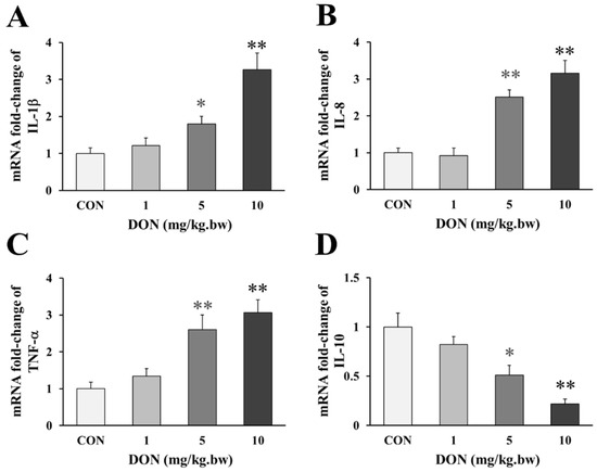 2.2. Effect of DON Treatment on the Expression of Inflammatory Factors in the Duodenum of Laying Hens