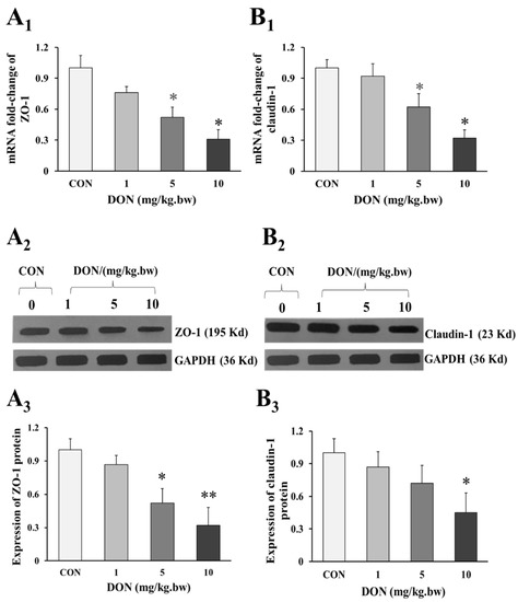 2.3. Effect of DON Treatment on the Expression of Tight Junction Proteins in the Duodenum of Laying Hens