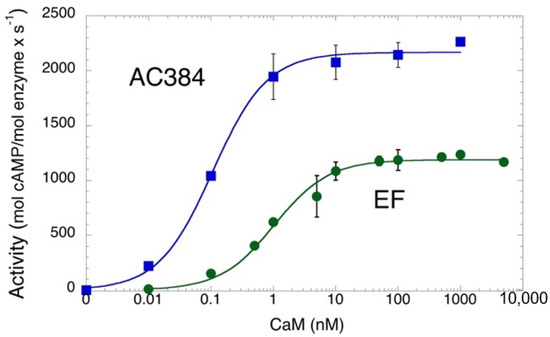 CaM-dependent AC activity of B. pertussis AC384 (blue) and B. cereus EF enzymes (green). AC activities (expressed in mol of cAMP produced per mol of enzyme per sec) at the indicated CaM concentrations were fitted to equation: A = (AMax × [CaM])/(KD + [CaM]). Maximal activities (AMax) of 2165 ± 30 and 1183 ± 22 s−1 were calculated for AC384 and EF, respectively, while the CaM concentration at half-maximal activation (≈KD) were 0.11 ± 0.01 and 1.04 ± 0.13 nM for AC384 and EF, respectively.