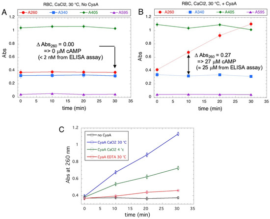 Purified CyaA was diluted in erythrocyte suspensions and incubated for 20 min at 30 °C in the presence of calcium (or in the presence of EDTA, or at 4 °C as controls). The cells were then extensively washed, resuspended in a small volume, and lysed with non-ionic detergent (e.g., Tween 20). The AC activities of the lysed samples were then assayed for various incubation times (0, 10, 20, and 30 min), and the absorption of the Al2O3 supernatants of all samples were recorded at different wavelengths (ie 260, 340, 405, and 595 nm). As anticipated, the cell lysates showed high absorption at 260, 340, or 405 nm (Figure 5). Yet, in control erythrocytes not incubated with CyaA, the absorption values remained constant over all the incubation periods (Figure 5A). In lysates of cells incubated with CyaA at 30 °C and in the presence of calcium (Figure 5B), the absorption at 260 nm (A260) increased linearly with time while the absorption at other wavelengths remained constant. By independently monitoring the cAMP content in the Al2O3 supernatants with an ELISA assay, we confirmed that the A260 increase precisely corresponded to the synthesis of cAMP due to the CyaA enzyme bound to cells (Figure 5B). The binding of CyaA to erythrocytes at 4 °C in the presence of calcium or at 30 °C in the absence of calcium (Figure 5C) was reduced in accordance with prior studies [41,42,43,44,45]. Hence, this spectrophotometric assay may be adapted to monitor AC toxin activity in complex cell extracts despite high absorption at useful wavelengths.