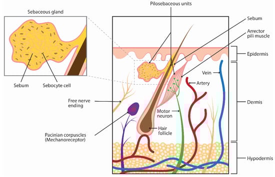 Oily skin (seborrhea) is a common dermatologic concern resulting from excess production of sebum [1,2,3]. In humans, sebum comprises a mixture of triacylglycerols, diacylglycerols, and free fatty acids (together account for 50–60%), wax esters (20–30%), squalene (10–16%), cholesterol esters (2–4%), and metabolites and debris of sebocytes, or sebum-producing cells [4,5,6]. Sebum functions to maintain skin integrity by reducing water loss and increasing lubrication [7]. Sebum also has anti-bacterial and photoprotective properties [8]. It is produced by sebocytes within sebaceous glands, skin appendages that, with the hair follicle, make up the pilosebaceous unit (Figure 1). Sebocyte stem cells proliferate within the sebaceous gland and then differentiate, accumulating lipids, into mature lipid-containing sebocytes. Once sebocytes become terminally differentiated, they undergo holocrine secretion, where they rupture and release accumulated lipids, or sebum [7,9,10].