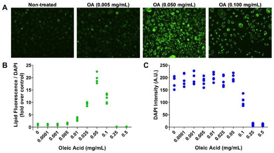 Sebocytes are characterized by their ability to differentiate, accumulate lipid droplets, and eventually rupture and release lipids via holocrine secretion. To generate an in vitro model of oily skin, we used the human sebocyte cell line SEB-1 isolated from the facial skin of a 55-year-old male donor (Table 1) [47]. We tested the ability of 6 known lipogenic stimuli and 1 additional potential stimulus (OA; based on its similarity to linoleic acid) to induce consistent, robust sebocyte lipogenesis and lipid accumulation without holocrine secretion in SEB-1 cells. Doses were informed by available literature for each stimulator (see Section 1) and pilot studies. It should be kept in mind the growth media already contains some of these factors, including FGFs. Treatment time of 1 day was selected since it was sufficient to induce robust lipogenesis and less likely to result in holocrine-like secretion and cell division, both factors that could impact the total amount of lipids per cell. All tested stimuli significantly increased the amount of lipids; DHT and OA led to the highest increase in lipids relative to untreated controls (Figure S1, panel A). Note that since cell viability was not measured, it is possible that treatment with some of these stimulating factors led to holocrine-like secretion and cell death, precluding identification of all effective inducers. This was later observed with higher concentrations of OA (Figure 2). To monitor lipogenesis and cell viability in parallel, DHT and OA were tested again with lipid droplet accumulation normalized to cell number based on DAPI staining (Figure S1, panel B). OA (0.05 mg/mL; ~16-fold over control) was twice as efficacious as DHT (100 µM; ~6-fold over control) at inducing lipogenesis (Figure S1, panel B). Thus, OA was chosen as the lipogenic stimulus for our in vitro model and used in further experiments.