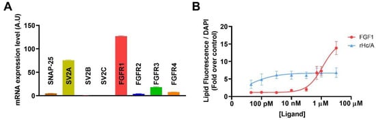 Expression of known and potential BoNT/A receptors and SNARE target in sebocyte (SEB-1) cells and potency of rHC/A and fibroblast growth factor 1 (FGF1) on SEB-1 cell lipogenesis. (A) RNA-Seq from SEB-1 cells was performed 3 days after plating to evaluate the mRNA expression level of synaptosomal-associated protein 25 (SNAP-25), synaptic vesicle protein 2 A-C (SV2A-C), and FGFR1-4. Data represent means from 5 replicates + SEM. (B) Dose–response curves showing the amount of lipids per cell, measured using a Nile red fluorescent dye (lipid droplet fluorescent assay) and normalized to cell number using DAPI staining, after 24 h treatment with FGF1 or rHC/A (5 pm–10 µM). Data shown as fold over control (untreated cells). Goodness of fit calculation showed r2 values of r2 = 0.48 (rHC/A) and r2 = 0.79 (FGF1). Data represent means from 5 replicates ± SEM.