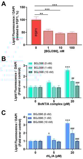 Given the ability of FGF1 to induce lipogenesis, and reports of BoNT/A binding FGFR, the involvement of FGFR in sebocyte lipogenesis was further evaluated. Increasing concentrations of the FGFR1-3 inhibitor BGJ398 [54] (1–100 nM) decreased the FGF1-induced lipogenesis by ~45–55% (p < 0.01) (Figure 6A). A dose of either 1 or 10 nM BGJ398 was then used in combination with either BoNT/A complex (Figure 6B) or rHC/A (Figure 6C). At a dose of 20 pM of BoNT/A complex or rHc/A, BGJ398 decreased lipogenesis induced by BoNT/A complex or rHC/A by ~60% (p < 0.01) and ~90% (p < 0.001), respectively (Figure 6B,C). These results suggest that the effects of BoNT/A on sebocyte lipogenesis are mediated at least partly via FGFR and independent from the light chain activity.