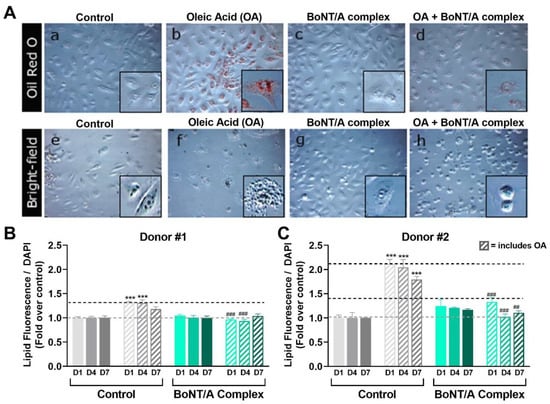 Effect of native BoNT/A complex on naive and OA-stimulated human primary sebocytes. (A) Human primary sebocytes (donor #1) were treated with 0.125 mg/mL OA, BoNT/A complex (20 pM), or both (OA + BoNT/A complex). Lipid accumulation was visualized by microscopy after Oil Red O staining (upper panels) and using bright field (lower panels). OA-induced lipid accumulation is visible in panel b and holocrine-like secretion is visible in panel f. Co-treatment with 20 pM BoNT/A complex for 1 day reduced OA-induced accumulation of intracellular lipids (panel d) and prevented or delayed holocrine secretion (panel h). Treatment with BoNT/A complex alone did not affect the amount of sebum lipids (panel c) nor morphology of the cells (panel g). Square boxes show higher magnification images of each condition. (B,C) Human primary sebocytes (donor #1 and #2) were treated with 0.125 mg/mL OA, and intracellular lipids were measured using a Nile red fluorescent dye (lipid droplet fluorescence assay) and normalized to the cell number using DAPI staining. Data shown as fold over control (untreated cells). Though donors #1 and #2 had different amounts of lipid increases after OA treatment (1, 4, or 7 days), co-treatment with 20 pM BoNT/A complex prevented the OA-induced increase in lipids in both, keeping it at, or close to, the baseline level (100% and 130% on day 1, respectively). Data represent means from 5 replicates + SEM. *** p < 0.001 vs. control; ## p < 0.01, ### p < 0.001 vs. OA.