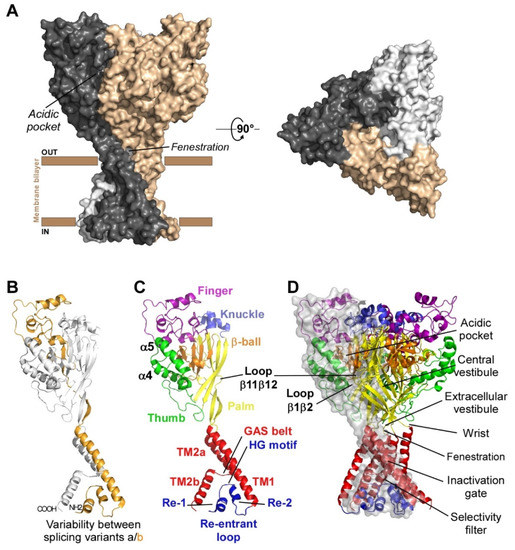 Structure of ASICs. (A) Trimeric organization of ASICs (left panel: side view, right panel: top view). (B) Tridimensional skeletal model of a single subunit where variable regions between isoforms “a” and “b” of rat ASIC1 and ASIC2 are highlighted in gold. (C) Structure of a single subunit of chicken ASIC1 in resting state (the different sub-domains are shown in specific colors; PDB ID: 6vtl). (D) Skeletal 3D representation of a functional channel formed by the assembly of three subunits. A transparent grey surface was added to one subunit to delineate the interface between two adjacent subunits. Same colors as in (C) for the different sub-domains, and key structural domains mentioned on the right. Cytoplasmic N- and C-termini, whose structures are unknown, are not shown. Designed with PyMOL software.
