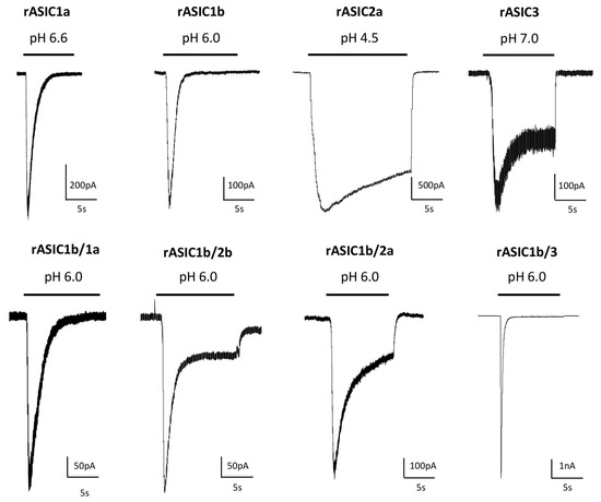 Diversity of currents flowing through homo- and heterotrimeric cloned ASICs. Original current traces of rat heterologously expressed ASIC currents recorded from HEK293 cells depending on the composition in ASIC subunits, activated from pH 7.4 to the indicated test pH, at −60 mV. Homotrimeric channels result from the expression of only one type of ASIC subunit (indicated above each current), whereas heterotrimeric channels result from the co-expression of two different subunits (1:1 ratio in transfection). The corresponding current noted rASIC1b/1a, for example, results from the co-expression of rASIC1b and rASIC1a subunits.
