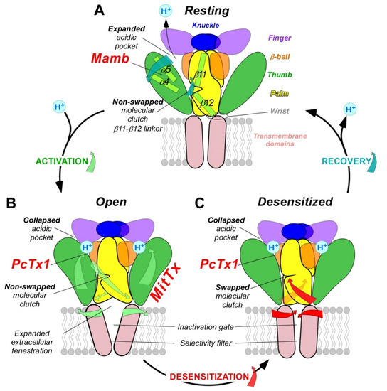 pH-dependent gating mechanisms of ASICs and interaction with toxins. ASIC gating involves three conformational states. (A), high pH resting state, which is stabilized by the toxin mambalgin (see Section 2.4) (major domains involved are indicated with the same color code as in Figure 1). (B), low pH open state, which is stabilized by the toxin MitTx (see Section 2.3) and also partially by the toxin PcTx1 (see Section 2.2). (C), low pH desensitized state also promoted by PcTx1. To illustrate the recovery process in (A), the deprotonation mechanism of only one acidic pocket is presented. Blue (A), green (B) and red (C) arrows show critical conformational changes during recovery, activation and desensitization processes, respectively. For clarity, only two subunits are shown.