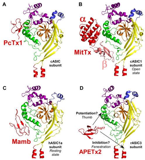 Four ASIC-targeting peptide toxins have been extensively characterized to date: the peptide toxins PcTx1 (psalmotoxin) from spider [96], APETx2 from sea anemone [97], and mambalgin (Mamb, with isoforms 1, 2 and 3) from mamba snakes [33,98], and the heterodimeric protein MitTx from coral snake [99].