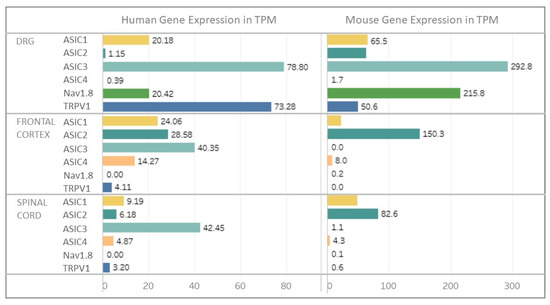 - Papalampropoulou-Tsiridou, M.; Labrecque, S.; Godin, A.G.; De Koninck, Y.; Wang, F. Differential Expression of Acid—Sensing Ion Channels in Mouse Primary Afferents in Naïve and Injured Conditions. Front. Cell. Neurosci. 2020, 14, 103. [Google Scholar] [CrossRef]
