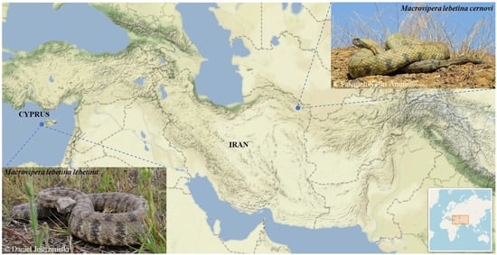 - Afroosheh, M.; Kazemi, S.M. Macrovipera lebetina cernovi (Ophidia: Viperidae), a newcomer to Iran. In Proceedings of the SEH European Congress of Herpetology and DGHT Deutscher Herpetologentag, Luxembourg, 25–29 September 2011. [Google Scholar]