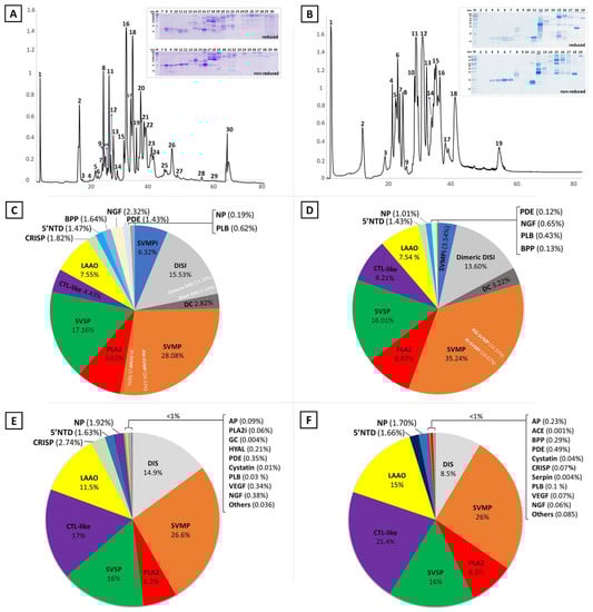 Venomics analysis of M. l. lebetina from Cyprus and M. l. cernovi from Iran. (A) Reverse-phase chromatographic separation of the venom proteome of M. l. lebetina, and (B) M. l. cernovi. The chromatographic fractions of both venoms were collected manually and analyzed by SDS-PAGE in both, reduced (upper section) and non-reduced (lower section), condition. (C,E) The pie charts indicate the identified protein families and their relative abundances (as percentage of total detected proteins) within the venom of M. l. lebetina, and (D,F) M. l. cernovi as determined either from the peak areas of reverse-phase chromatography with the help of SDS-PAGE protein bands (C,D) or based on the normalized spectral abundance factor from single-shot whole venom bottom-up proteomics (E,F). Acronyms: SVMP, snake venom Zn2+-metalloproteinase; PLA2, phospholipase A2; SVSP, snake venom serine protease; CTL-like, Snaclec, C-type lectin-like protein; LAAO, l-amino acid oxidases; DIS, disintegrin; CRISP, cysteine-rich secretory protein; NGF, nerve growth factor; VEGF, vascular endothelial growth factor; PDE, phosphodiesterase; AP, aminopeptidase; ACE, angiotensin-converting enzyme; BPP, bradykinin-potentiating peptides; PLB, phospholipase B; PLA2i, phospholipase A2 inhibitor; HYAL, hyaluronidase; NP, natriuretic peptide; 5′NTD, 5′-nucleotidase; DC, disintegrin-like/cysteine-rich fragment of PIII-SVMP; SVMPi, snake venom metalloproteinase inhibitor; NGF, nerve growth factor.