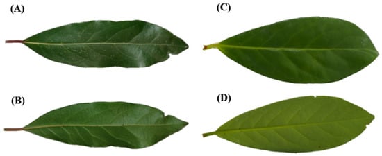 Macro-morphology of the leaf: (A,B)—L. nobilis; (C,D)—P. laurocerasus; (A,C)—upper surface; (B,D)—lower surface.