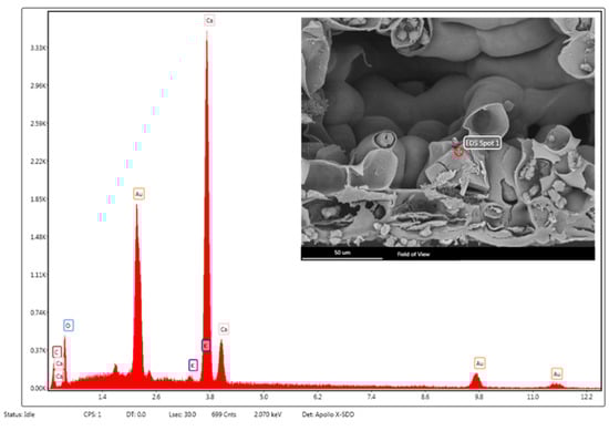 SEM–EDS structural characterization of a prismatic crystal of calcium oxalate in P. laurocerasus leaf. The peaks denoted by “Au” correspond to the gold sputter coating of the sample.