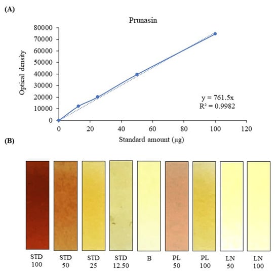 Semi-quantitative determination of cyanogenic glycosides by the picric acid method: (A) prunasin calibration curve, built by plotting the densitometric readings of the test strips against the standard amount (µg) tested. (B) Representative figure of the test strips, after treatment with different volumes (100, 50, 25, 12.50 µL) of the reference standard prunasin (STD, 1 mg/mL), blank (B) and with two different volumes (50 and 100 µL) of P. laurocerasus and L. nobilis leaf extracts (PL and LN, 1 mg/mL).