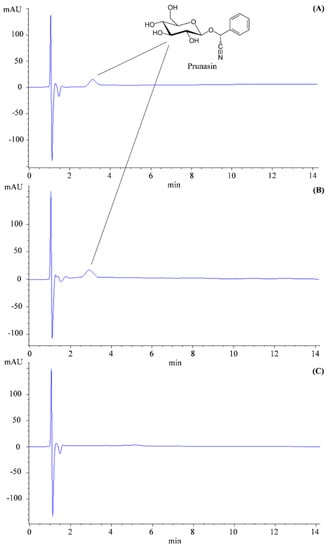 Finally, with reference to forensic cases, in which it is more difficult to detect the presence of these substances in biological samples without an adequate analytical sensitivity, a rapid quali-quantitative analysis has been developed by HPLC-DAD. As can be seen from Figure 8, which shows the representative chromatograms of the standard prunasin (Figure 8A), of the cherry laurel extract (Figure 8B) and of the laurel extract (Figure 8C) acquired at 220 nm, the analytical method resulted in a fast and simple detection of prunasin without analytical interference.