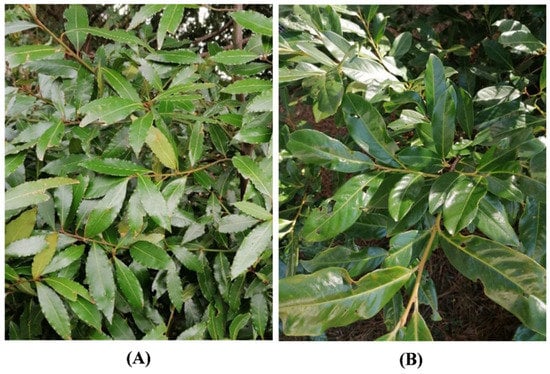 The correct identification of plant species was carried out according to Pignatti et al. [,]. Laurus nobilis (laurel) is a perennial, aromatic, and dioecious shrub belonging to the Lauraceae family, which grows naturally in the Mediterranean area (Figure 9A). Prunus laurocerasus (cherry laurel) is an evergreen outdoor shrub belonging to the Rosaceae family, native to western Asia (Figure 9B). Leaves of both species were collected from Genoa’s Botanical Garden (Liguria, Italy) in March 2021.