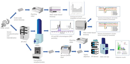 A schematic overview of the complete analytical and biochemical workflow. There are two main experiments shown in Figure 1 that run simultaneously in this study: (i) crude snake venom plate reader-based bioassaying (for assessing inhibition potential of anticoagulant activity by the small molecule inhibitors varespladib and marimastat), (ii) venom separation (using reversed-phase high-performance liquid chromatography; RP-HPLC or LC in short) coupled to UV detection followed by mass spectrometry (MS) with parallel nanofractionation for high-resolution fraction collection of separated toxins onto 384-well plates. Well plates with nanofractionated venom toxins are then vacuum centrifuged to dryness overnight, followed by bioassaying to assess anticoagulant activity. This data obtained is then processed to deliver bioassay chromatograms. Dried well plates can also be used for subsequent toxin identification by proteomics. Key: TIMS-TOF-MS, trapped ion mobility spectrometry time of flight mass spectrometry; HRMS, high-resolution mass spectrometry (HRMS); RP-nanoLC, reversed-phase nanoflow liquid chromatography.