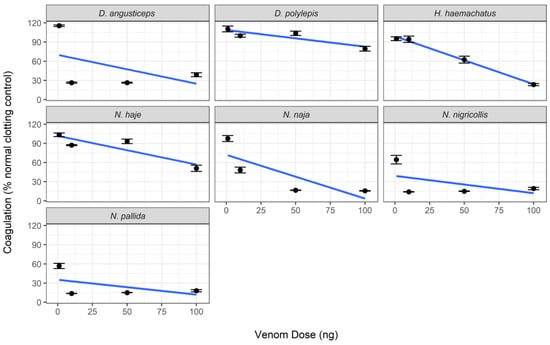 Venoms from elapids demonstrate anticoagulant activity on bovine plasma. Crude venom activity was measured as the mean area under the curve (AUC) of each venom concentration in the relevant clotting period (24–71 min), standardised by the mean AUC of the negative control in the same period. Lines were generated using a linear model and error bars represent the standard error of the mean (SEM) of 3–7 replicates (wells containing excess bubbles caused reading errors and had to be removed from analysis).