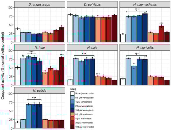 Anticoagulant venom activity of cobra venoms are inhibited by the PLA2 inhibitor varespladib. H. haemachatus, N. haje, and N. naja additionally show significant inhibition by some marimastat doses. Clotting activity was measured as the mean area under the curve (AUC) of each sample type in the relevant clotting period (22–71 min), standardised by the mean AUC of the negative control in the same period. Error bars represent the standard error of the mean (SEM) of 3–4 measurements (some sample wells needed to be removed due to disruption in readings caused by bubbles). Asterisks represent significant increases in coagulant activity as measured by one-way ANOVA and Dunnett’s Multiple Comparison post-hoc testing; *—p < 0.05, **—p < 0.01, ***—p < 0.0001.