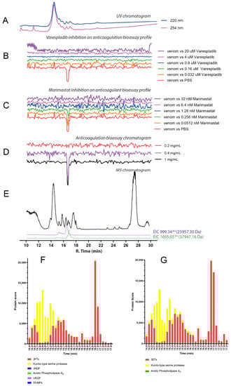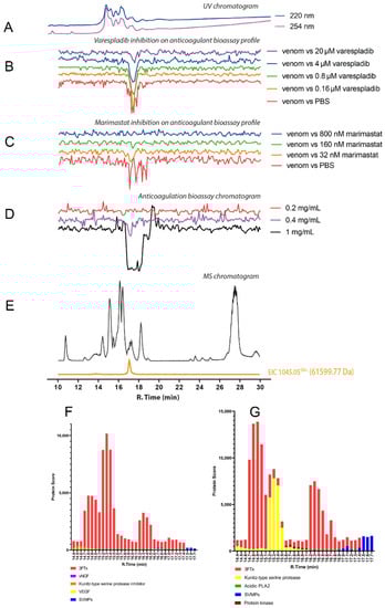 Correlation of LC-UV and MS chromatogram and bioassay chromatogram of D. polylepis venom. (A) UV chromatogram of D. polylepis venom (1 mg/mL, 50 μL injection volume, post-column split into 1:9 ratio. The smaller portion went to UV (220 and 254 nm recorded), and then to MS detection. Superimposed bioassay chromatograms resulting from analyses of D. polylepis venom (1 mg/mL, 50 µL injection volume) in the presence of different concentrations of (B) varespladib and (C) marimastat. (D) Superimposed anticoagulation bioassay chromatograms resulting from analyses of several diluted D. polylepis venom samples ranging from 1 mg/mL to 0.2 mg/mL (50 µL per injection). (E) Base peak chromatogram (BPC) and extracted ion currents (XIC) mass spectrometry. Bioassay chromatograms are correlated to UV and MS. Proteomic annotation of D. polylepis venom using Mascot software against (F) the Swiss-Prot database and (G) species-specific venom gland transcriptomic-derived database. The protein score represents the probability that designated proteins, defined by elution time, are present in the sample.