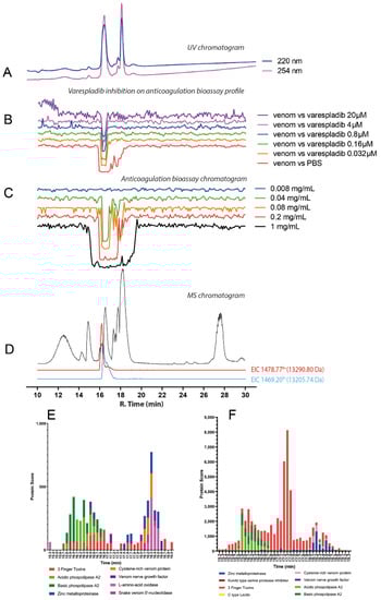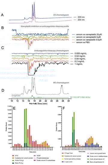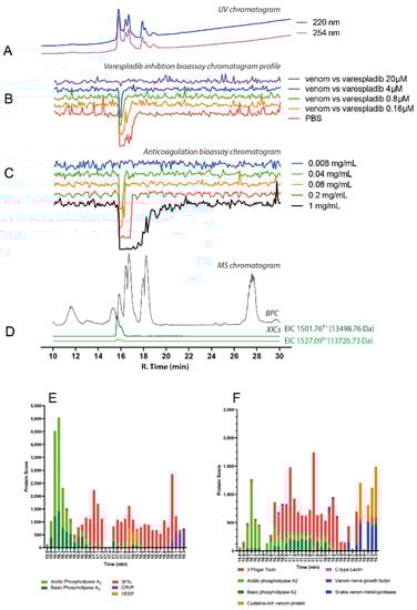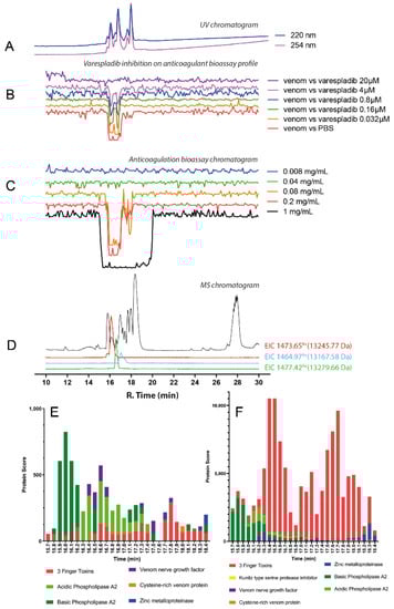 Correlation of LC-UV and MS chromatogram and bioassay chromatogram of N. nigricollis venom. (A) UV chromatogram of N. nigricollis venom (1 mg/mL, 50 μL injection volume, post-column split into 1:9 ratio and a smaller portion went to UV (220 and 254 nm recorded); and then to MS detection. Superimposed bioassay chromatograms resulting from analyses of N. nigricollis venom (0.2 mg/mL, 50 µL injection volume) in the presence of different concentrations of (B) varespladib. (C) Superimposed anticoagulation bioassay chromatograms resulting from analyses of several diluted N. nigricollis venom samples ranging from 1 mg/mL to 0.008 mg/mL (50 µL per injection). (D) Base peak chromatogram (BPC) and extracted ion currents (XIC) mass spectrometry. Bioassay chromatograms are correlated to UV and MS. Proteomic annotation of N. nigricollis venom using Mascot software against (E) the Swiss-Prot database and (F) species-specific venom gland transcriptomic-derived database. The protein score represents the probability that designated proteins, defined by elution time, are present in the sample.