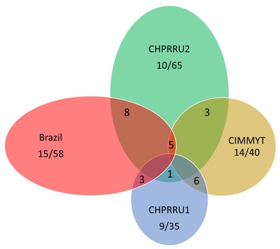 Overlapping pathways identified via PAST in different GWAS panels (Brazil, CHPRRU1, CHPRRU2, and CIMMYT). In four different panels, size of the bubble corresponds to the number of pathways identified as associated with aflatoxin level at p < 0.05 in each; this is also indicated in the numbers within the bubble after the slash. Number of pathways identified in at least one other panel is shown before the slash. Pairwise comparisons are the numbers in the intersections (only taken 2 panels at a time, or all at once, center number).