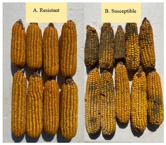 Examples of Aflatoxin Ear Rot. (A) resistant vs. (B) susceptible maize hybrids.