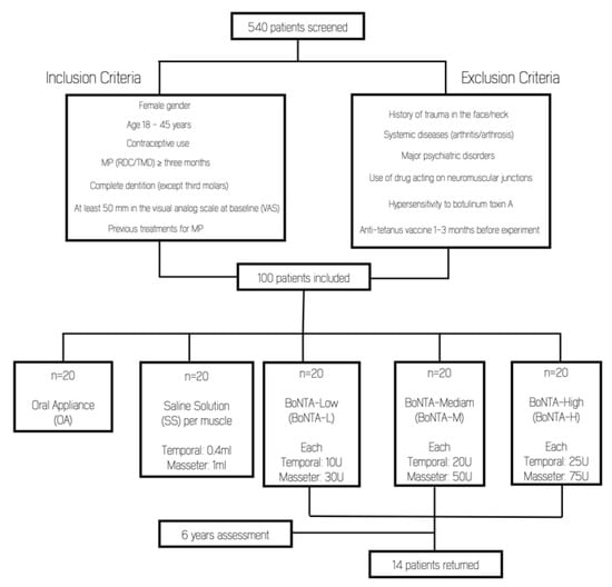 Therefore, subjects included in the present study were a convenience sample of the study of De la Torre Canales et al. (2020) [13], which assessed the efficacy and adverse effects of different doses of BoNT-A up to six months of follow-up. Since the primary objective of this study was to assess the reversibility of adverse effects, the positive (splint) and negative (saline solution) control groups were not included, due to the absence of statistically significance differences in the previous one [13]. Therefore, only participants assigned to the BoNT-A groups (n = 60) were contacted. The patients were recruited via telephone for the 6-year assessment.