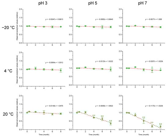 Variations of the relative concentrations of GYM-A under different temperature and pH conditions for 8 months. The dashed line represents the linear regression. * and ** indicate statistically significant difference compared with the initial status at p < 0.05 and p < 0.01, respectively.