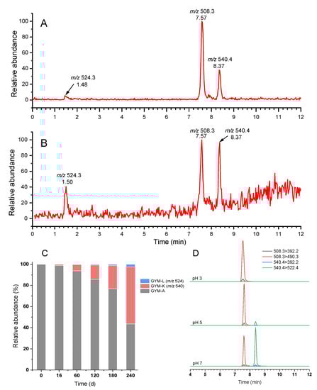 Non-target screening and validation of conversion products: precursor ion scan chromatograms of the product ion at m/z 392.2 (A) and m/z 136.1 (B); the relative abundance of GYM-A, GYM-K (m/z 540) and GYM-L (m/z 524) at different time points (20 ℃, pH 7) (C); LC-MS/MS chromatograms for GYM-A and GYM-K at different pH under 20 ℃ after 8 months (D).