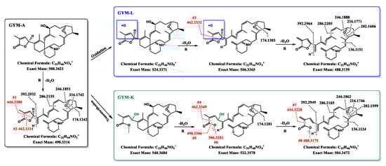 In order to further identify the structures of both new compounds, the MS2 spectra were acquired by LC-HRMS/MS (Figure 5). The fragmentation spectra generated by the precursor ions at m/z 524.3327 (C32H46O5N+) and m/z 540.3698 (C33H50O5N+) were very close to that of GYM-A, with a lot of overlap, containing the GYM-A characteristic fragments of m/z 392.2932, 202.1588, 162.1275 and 136.1120 (Figure 5A). Hence, both hypothesis compounds GYM-K and GYM-L were speculated to be structurally related to GYM-A. The main difference in the MS2 spectra was the fragment at m/z 446.3380 in GYM-A versus that at m/z 462.3349 in both hypothetical compounds.