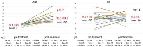 The left side of the figure illustrates the changes in serum zinc levels before and after zinc acetate hydrate administration (for 12 months). The serum zinc level increased significantly after zinc acetate hydrate administration. The right side of the figure reveals the changes in serum hemoglobin (Hb) levels before and after zinc acetate hydrate administration (12 months). Serum Hb levels did not change significantly after zinc acetate hydrate administration. p: p-value difference; SD: standard deviation.