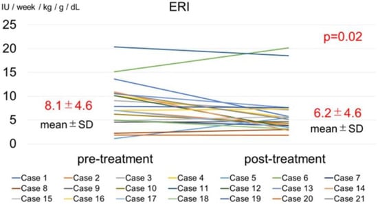 Serum zinc concentration significantly increased, from 33.0–59.0 mg/dL (52.4 ± 7.6 mg/dL) to 57.0–124.0 mg/dL (84.1 ± 16.3 mg/dL; p < 0.01) (Figure 1), and blood Hb levels did not change significantly, from 10.0–13.6 g/dL (11.5 ± 1.0 g/dL) to 10.2–12.4 g/dL (11.4 ± 0.7 g/dL) (Figure 1). The ESA dose significantly decreased, from 0–12,000 IU/week (5630 ± 3351 IU/week) to 0–9000 IU/week (4428 ± 2779; p = 0.04). The ERI significantly decreased, from 0.0–18.2 (8.1 ± 5.1) to 0.0–16.0 (6.3 ± 4.3; p = 0.04) (Figure 2).