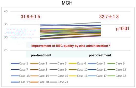 Changes in mean corpuscular hemoglobin (MCH) value before and after zinc acetate hydrate administration (12 months). The MCH value increased significantly after zinc acetate hydrate administration, therefore indicating efficient erythrocyte production. p: p-value difference; SD: standard deviation.