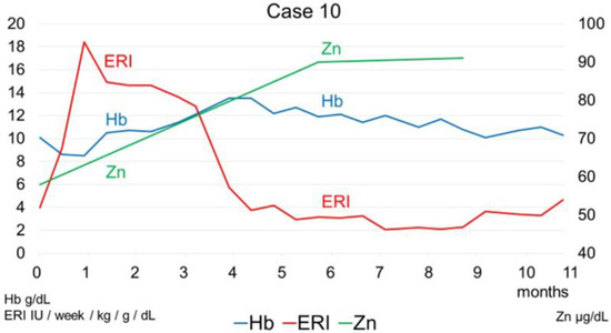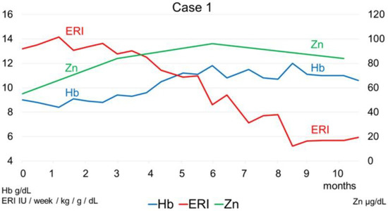 We examined the effects of zinc acetate hydrate supplementation on renal anemia with hypozincemia. Renal anemia is one of the major complications of chronic kidney disease that can affect prognosis. According to the guidelines, aiming for a serum hemoglobin (Hb) level of 10–12 g/dL is recommended [1,2,3]. Erythropoiesis-stimulating agents (ESA) are frequently used to treat renal anemia, but ESA-resistant anemia has become a problem in recent years [4]. The causes of ESA-resistant anemia include blood loss, iron deficiency, carnitine deficiency, and blood disorders. Deficiencies in trace elements, especially zinc, have also been reported as causes [5]. Based on the above, we believe that ESA-resistant anemia should be thoroughly investigated in the treatment of renal anemia, and zinc deficiency should be constantly monitored.
