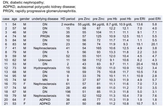 The Figure 6 below presents the background of the 21 patients undergoing hemodialysis who received zinc acetate hydrate for renal anemia in this study.