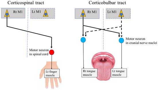 Anatomically, each muscle of the stomatognathic system receives innervation from the bilateral M1 through the corticobulbar tract, which terminates in motor neurons within the CN nuclei (Figure 1). In contrast, the muscles of the upper and lower limbs are predominantly innervated by the contralateral cortex through the corticospinal tract, which terminates in motor neurons within the spinal cord (Figure 1). Indeed, a previous study in patients with epilepsy showed that direct unilateral cortical stimulation of the M1 areas for the oral and upper limb muscles induced bilateral oral movements but unilateral limb movements [24].