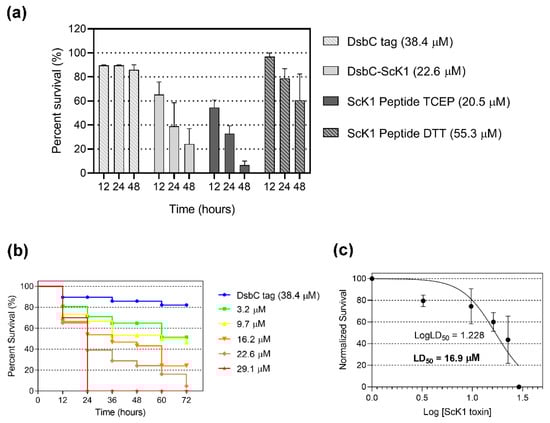In this investigation, the insecticidal capacity of the ScK1 peptide was assessed. The purified peptide presented toxicity against fruit fly, indicating that it is produced in the active form by E. coli. The toxic effects were demonstrated using insect injection and feeding assays. In the injection assays, the DsbC-ScK1 fusion protein and isolated ScK1 peptide caused paralysis and mortality in a dose-dependent manner. The calculated LD50 within 24 h was 16.9 µM (52.3 ng/fly), indicating substantial insecticidal activity. Additionally, lower doses (<9.7 µM) can trigger significant sublethal effects that may inhibit insect fitness. Despite being alive, flies injected with lower doses exhibited impaired movement over extended periods.