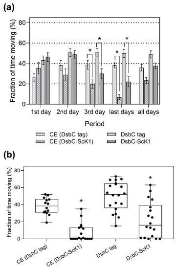 Female flies aged 6–10 days were transferred to transparent plastic tubes (70 mm × 5 mm) placed in a standard ethoscopic arena (10 × 2), and each tube was sealed with a cotton plug at one end and parafilm at the other end outside the arena. Glass microcapillary tubes were inserted vertically at the end of each tube to supply the liquid food. The flies were starved for 4 h to encourage liquid feed consumption and allowed to acclimatize to their new environment during the first day before the start of the assay. At the beginning of the assay, flies were subjected to liquid feed medium (LFM) composed of 1% sucrose, 1% skim milk, and 6% blue food dye, supplemented with 500 µg/mL purified DsbC-ScK1. The other group was treated with the crude extract (65 mg/mL) of induced cells expressing the DsbC-ScK1 protein. Two control groups were used in the assay. One control group was treated with LFM supplemented with 500 µg/mL DsbC tag, and the second control group was treated with LFM supplemented with the crude extract of induced cells containing DsbC tag alone at a final concentration of 65 mg/mL. For each fly, 15 µL of each mixture was supplied daily through microcapillaries. Twenty biological replicates per treatment and control group were used for this assay. All behavioral activities of treated and control flies were recorded for five consecutive days at a controlled temperature of 25 °C using an ethoscope [