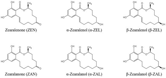 Zearalenone (ZEN) is a nonsteroidal estrogenic mycotoxin produced by Fusarium fungi such as Fusarium graminearum, Fusarium culmorum, and Fusarium crookwellense. It can be metabolized by plants, microorganisms, animals, and humans into many other derivatives and can contaminate animal feed. It is widely found in grains such as corn, wheat, sorghum, and their by-products [1]. The five derivatives of ZEN mainly include zearalanone (ZAN), α-zearalanol (α-ZAL), β-zearalanol (β-ZAL), α-zearalenol (α-ZEL), and β-zearalenol (β-ZEL) [2], and the chemical structures of ZEN and its derivatives (ZENs) are shown in Figure 1. ZENs have estrogen-like effects because of their similar chemical structures to 17 β-estradiol, and α-ZEL has the most pronounced estrogenic activity among the main derivatives [3]. ZENs bind strongly to estrogen receptors and produce estrogen-like effects, leading to disturbances in sex hormone function and reproductive disorders in livestock [4,5]. High doses of ZEN and α-ZEL have adverse effects on the male reproductive system, including significantly reducing sperm counts and production efficiency and serum testosterone concentrations [6]. ZEN and α-ZEL have endocrine-disrupting effects, leading to the disruption of pituitary gonadotropin secretion, which can significantly inhibit the synthesis and secretion of pituitary follicle-stimulating hormone in sows [7]. In addition, high doses of ZEN can induce a series of clinical symptoms in young sows, such as vulvar swelling and vaginal prolapse [7]. Studies in ruminants have shown that even lower intakes of ZEN could affect the ovarian antral follicles of dairy cows and impair their reproductive performance [8]. Other studies confirmed that ZEN also has toxic effects on the offspring of exposed animals. Exposure to ZEN reduced the number of piglets born alive and the litter birth weights of pregnant sows, and it was also reported to affect the reproductive functions of male offspring of pregnant mice via transgenerational cytotoxicity on spermatogonia [9,10]. In addition, ZENs are also hepatotoxic [11,12], genotoxic [13,14], and immunotoxic [15,16]. ZENs can be absorbed by humans or animals through moldy food and feed, and they can seriously harm human health by increasing the risk of human exposure through animal products such as meat, eggs, and milk [17]. Residues of ZENs in agricultural products are a serious human health problem based on their toxic effects. Therefore, it is important to establish an effective detection method for ZENs in feed that would help to produce high-quality feed, improve food safety, and ensure the health of livestock and humans.