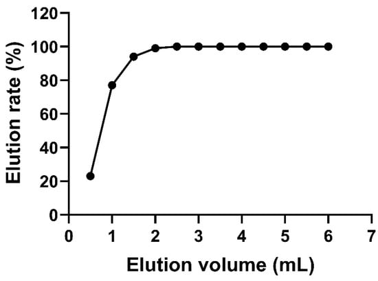 In addition, the effect of the eluent volume on the elution rate was investigated, and the results are shown in Figure 2. The elution rate increased gradually with the increase in methanol volume. When the methanol volume exceeded 2 mL, the elution rate reached 100%. Hu et al. [40] reported a recovery of 70–110% with an elution condition of 2 mL of methanol. Similarly, 2 mL of methanol was employed to elute the target zeranols in pig muscle, and it achieved recovery values of 74.5–105.0% [41]. In the present study, a 3 mL eluent of methanol was used to achieve sufficient elution effects and obtain good recoveries.