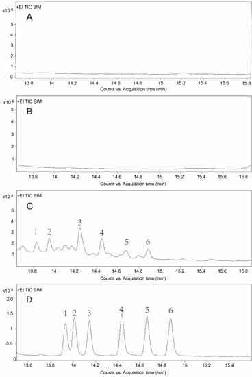 In order to meet the requirements of trace detection and ensure the quality of feed products, high-sensitivity analytical methods are required. In this study, the limit of detection (LOD) and limit of quantification (LOQ) were monitored based on 3 and 10 times the S/N ratios, respectively. Under the given GC-MS conditions, six targets in different matrices had LODs of 0.40–1.34 μg/kg and LOQs of 1.33–4.46 μg/kg (Table 3). Niknejad et al. [28] reported an LOQ of 8 μg/kg for ZEN GC-MS/MS analysis, and Pack et al. [51] established a GC-MS method for the determination of the ZEN and α-ZEL in swine tissues with an LOQ of 10 ng/g. Compared with those results, the LOQs of the ZENs in our study showed a higher sensitivity, and thus the established GC-MS method could be used for low-level ZEN analysis.