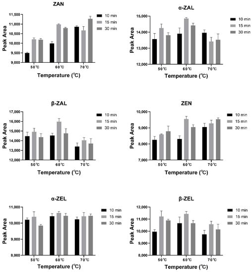 The derivatization times for mycotoxin analysis were generally 10–30 min, and the temperatures were around 60 °C in the previous studies [26,28,42]. Different derivatization temperatures (50, 60, and 70 °C) and derivatization times (10, 15, and 30 min) were set, and a mixed standard solution (100 ng/mL for each mycotoxin) was employed to explore the optimal derivatization conditions for this study (n = 3). It was found that five analytes (except ZAN) had the highest peak areas of 9548–15,975 when derivatized at 60 °C for 15 min (Figure 4). ZAN was found to have the highest peak area when derivatized at 70 °C for 30 min, but the average peak areas of 70 °C for 30 min (11,274) and 60 °C for 15 min (10,989) were very close. Hence, a derivatization condition of 60 °C for 15 min was chosen in the present study.
