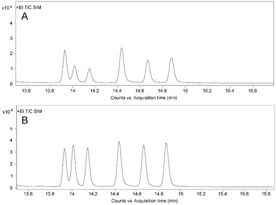 Total ion chromatograms of mixed standard solution. (A) Chromatogram before quantitative ion optimization (m/z 449 for ZAN, m/z 433 for α/β-ZAL, m/z 333 for ZEN, and m/z 305 for α/β-ZEL). (B) Chromatogram after quantitative ion optimization (m/z 307 for ZAN and α/β-ZAL, m/z 333 for ZEN, and m/z 305 for α/β-ZEL). The six peaks from left to right are ZAN, α-ZAL, β-ZAL, ZEN, α-ZEL, and β-ZEL, respectively.