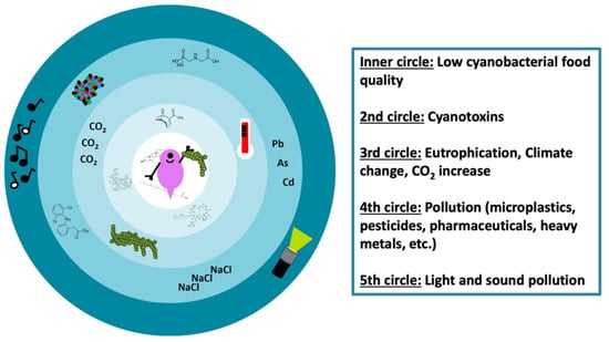 The “Circles of Hell” for Daphnia in the Anthropocene. The first two inner circles represent the effects of cyanobacteria on Daphnia with their additional constraints, i.e., low food quality plus cyanotoxicity. The third circle shows the factors that increase the frequency of cyanobacterial blooms or the strength of cyanotoxicity. The fourth and fifth circle show stressors that (might) have an additional effect on Daphnia ingesting cyanobacteria and their toxins (e.g., heavy metals such as Pb, As and Cd, road salts (NaCl) and light pollution).