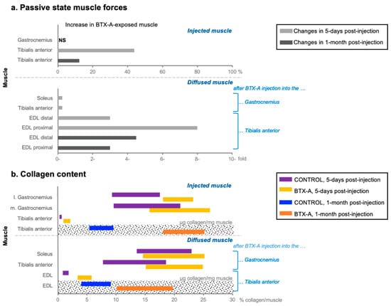 Passive muscle properties of rat hindlimb muscles are illustrated based on [,,,,,]. (a) Increases in passive (i.e., resting) state muscle forces in BTX-A exposed muscles compared with those of the control group The bars indicate that passive state forces increase in different percentages at different muscle lengths, and maximal increments are presented. EDL: extensor digitorum longus; NS indicates changes are non-significant. (b) Intramuscular collagen amounts of both BTX-A exposed and control group muscles. Data for both the injected and non-injected but diffused muscles due to the spread of the toxin are illustrated. The dotted shaded graph areas represent the studies in which the amount of collagen was quantitatively measured, whereas, in other areas, the percentages of ECM presented relative to fiber content.