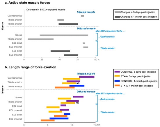 Active muscle properties of rat hindlimb muscles are illustrated based on [,,,,,]. (a) Decreases in active state muscle forces in BTX-A exposed muscles compared with those of the control group. The bars indicate that active state forces decrease in different percentages at different muscle lengths. EDL: extensor digitorum longus. (b) The muscle length range of force exertion of both BTX-A exposed and control group muscles. Data for both the injected and non-injected but diffused muscles due to the spread of the toxin are illustrated. NS indicates that changes are non-significant.