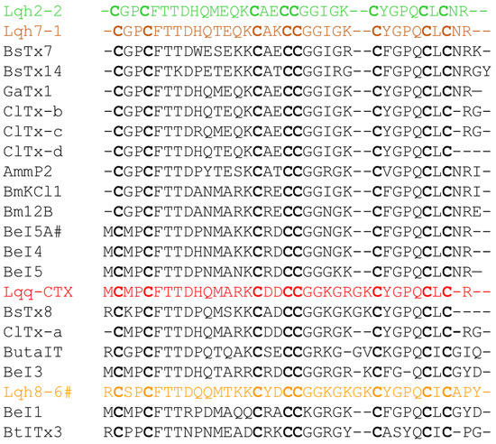 - Sautière, P.; Cestèle, S.; Kopeyan, C.; Martinage, A.; Drobecq, H.; Doljansky, Y.; Gordon, D. New toxins acting on sodium channels from the scorpion Leiurus quinquestriatus hebraeus suggest a clue to mammalian vs. insect selectivity. Toxicon 1998, 36, 1141–1154. [Google Scholar] [CrossRef]
